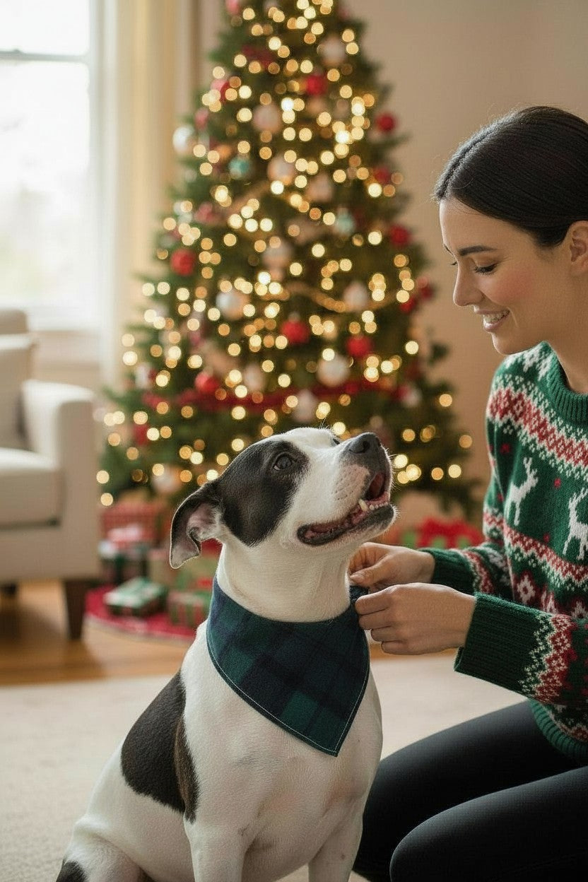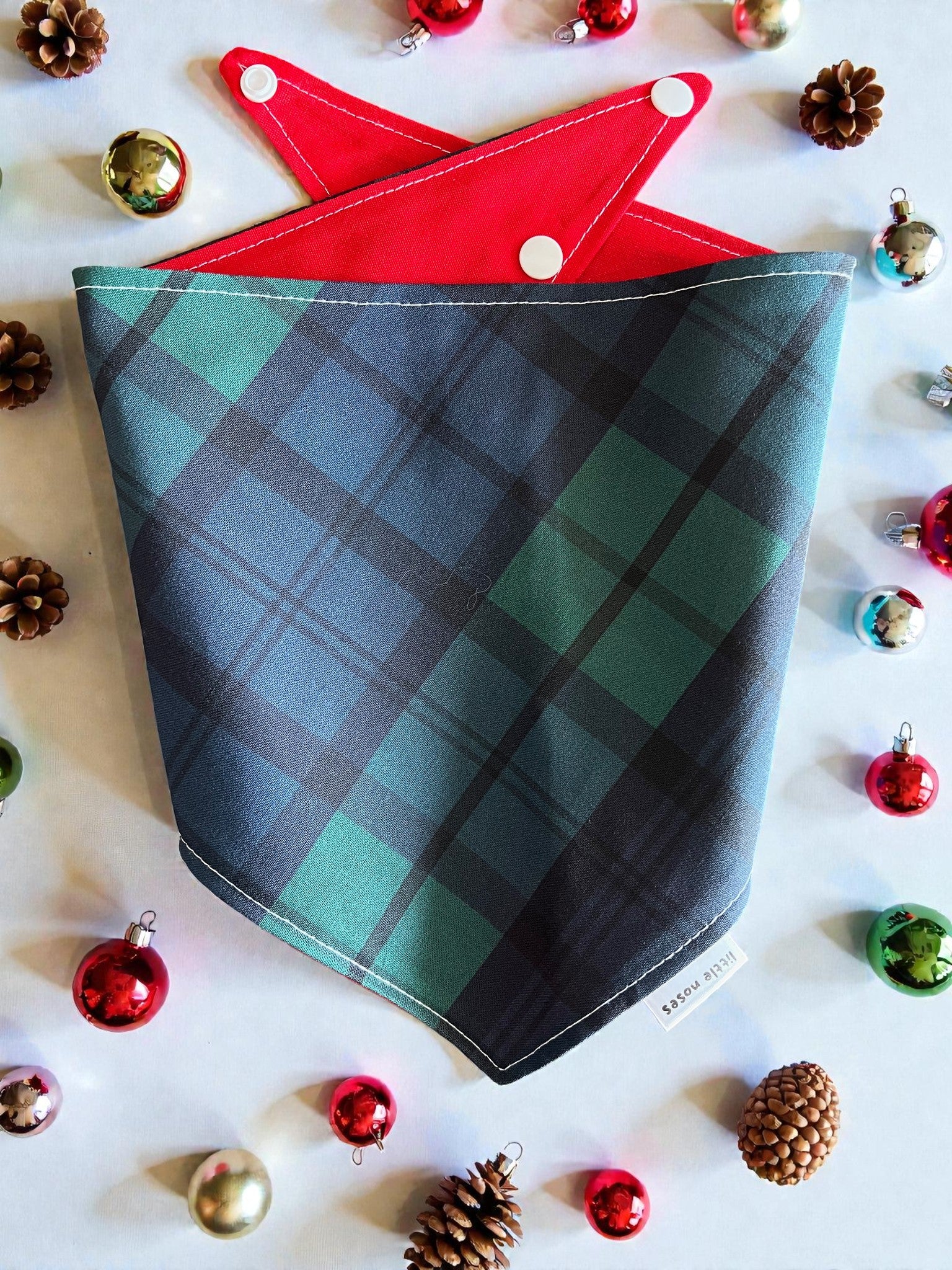 Green and blue plaid reversible pet bandana with an adjustable snap closure—perfect for holiday photos and festive celebrations. Crafted from 100% cotton for comfort and breathability, this double-sided design lets your furry friend rock two looks in one. Whether you're capturing Christmas memories or just adding seasonal flair, the easy-adjust snap keeps it secure without fuss. A versatile accessory that works year-round!